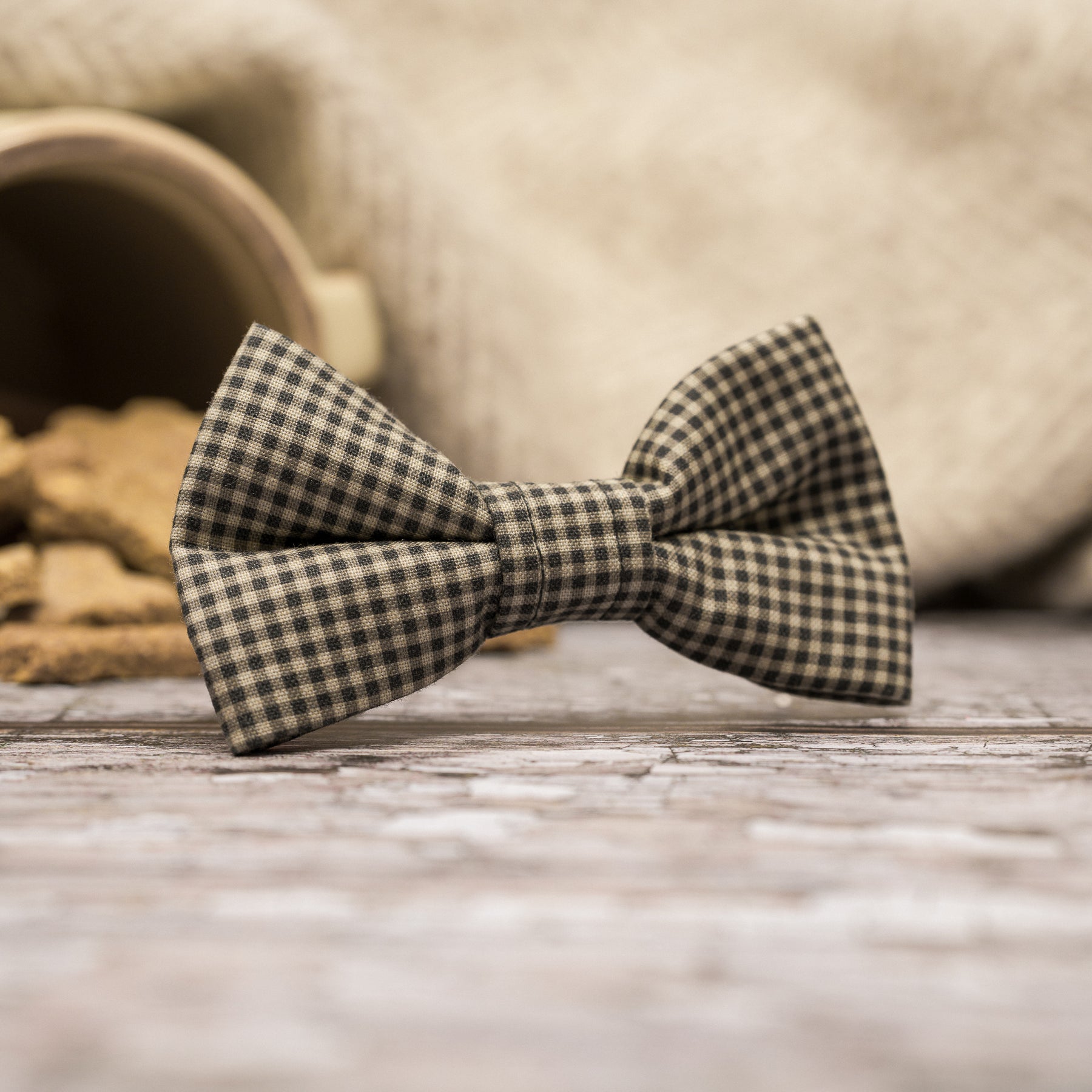 • tiny gingham checked dog  bow tie showing matching collar in greige