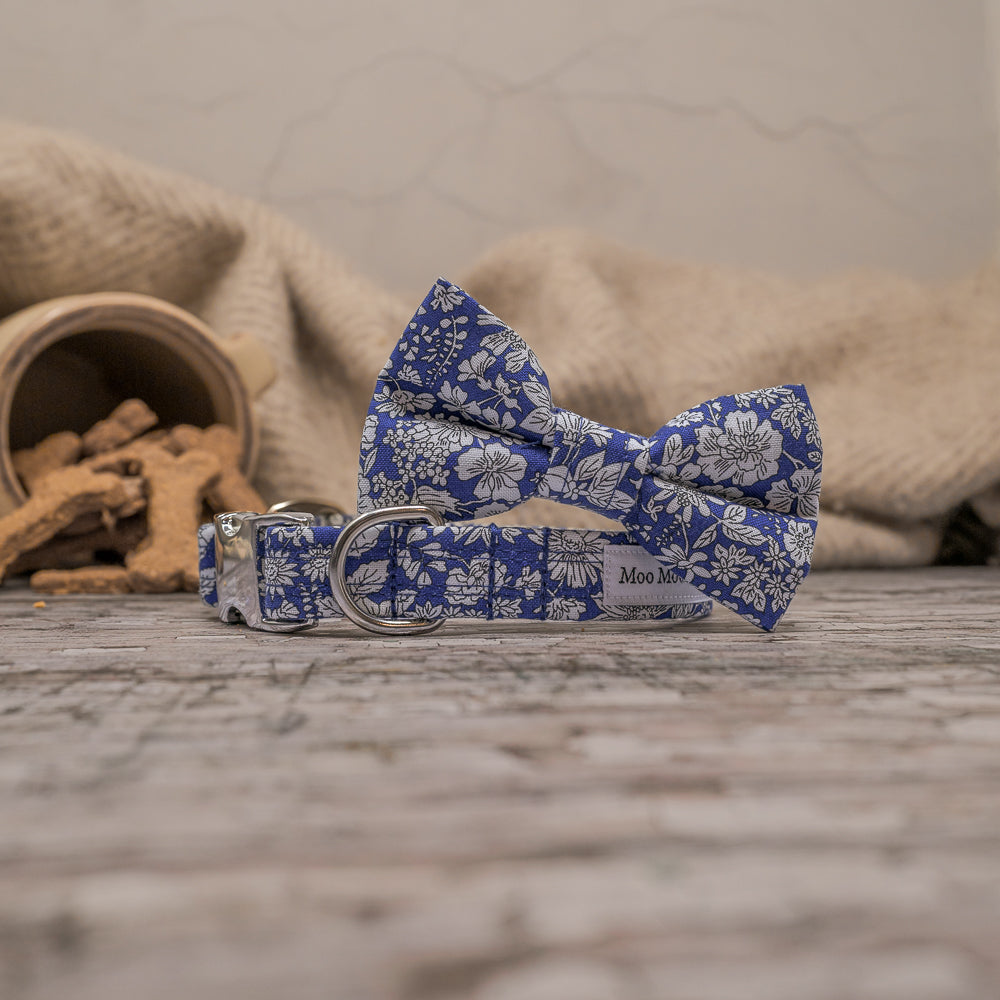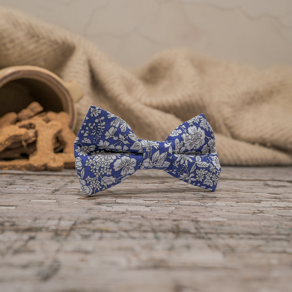 Emile is a blue floral bow tie for your dogs collar from the luxurious Liberty brand. Featuring a variety of mixed flowers including daisies, marguerites, peonies and cornflowers, arranged on a denim coloured background. For a more co-ordinated look, why not add the matching collar.