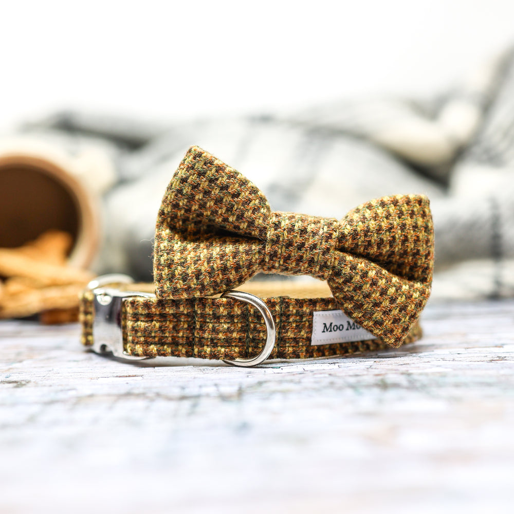 All Heritage bow ties are handmade from 100% Yorkshire wool with additional padding for that little added luxury. They slide over your dogs collar for a safe and stylish tailored look.
