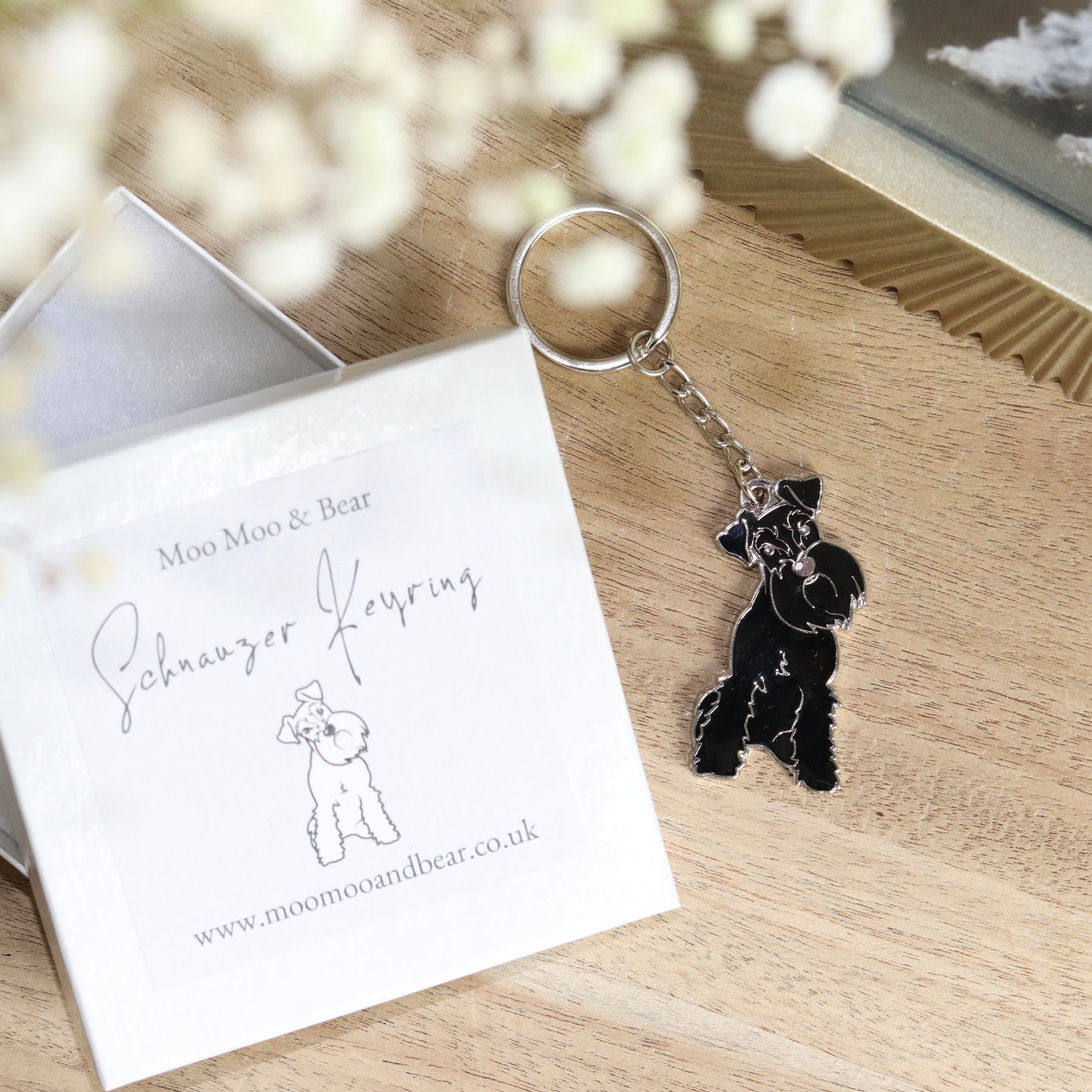 Featuring our very own schnauzer design in hardwearing enamel with a nickel plated chain and strong split ring. This beautiful Black sitting schnauzer enamel key ring could be used to keep your house keys safe or as a hanging charm on your bag. It will make the perfect gift for a dog lover. Why not collect all four breed colours!