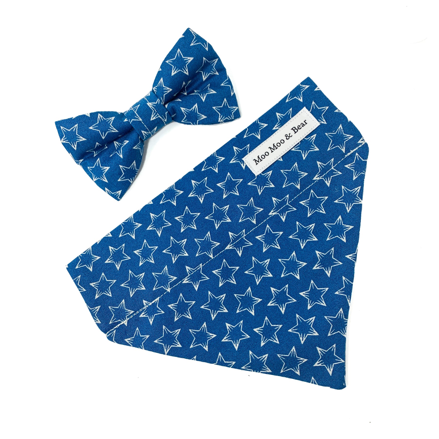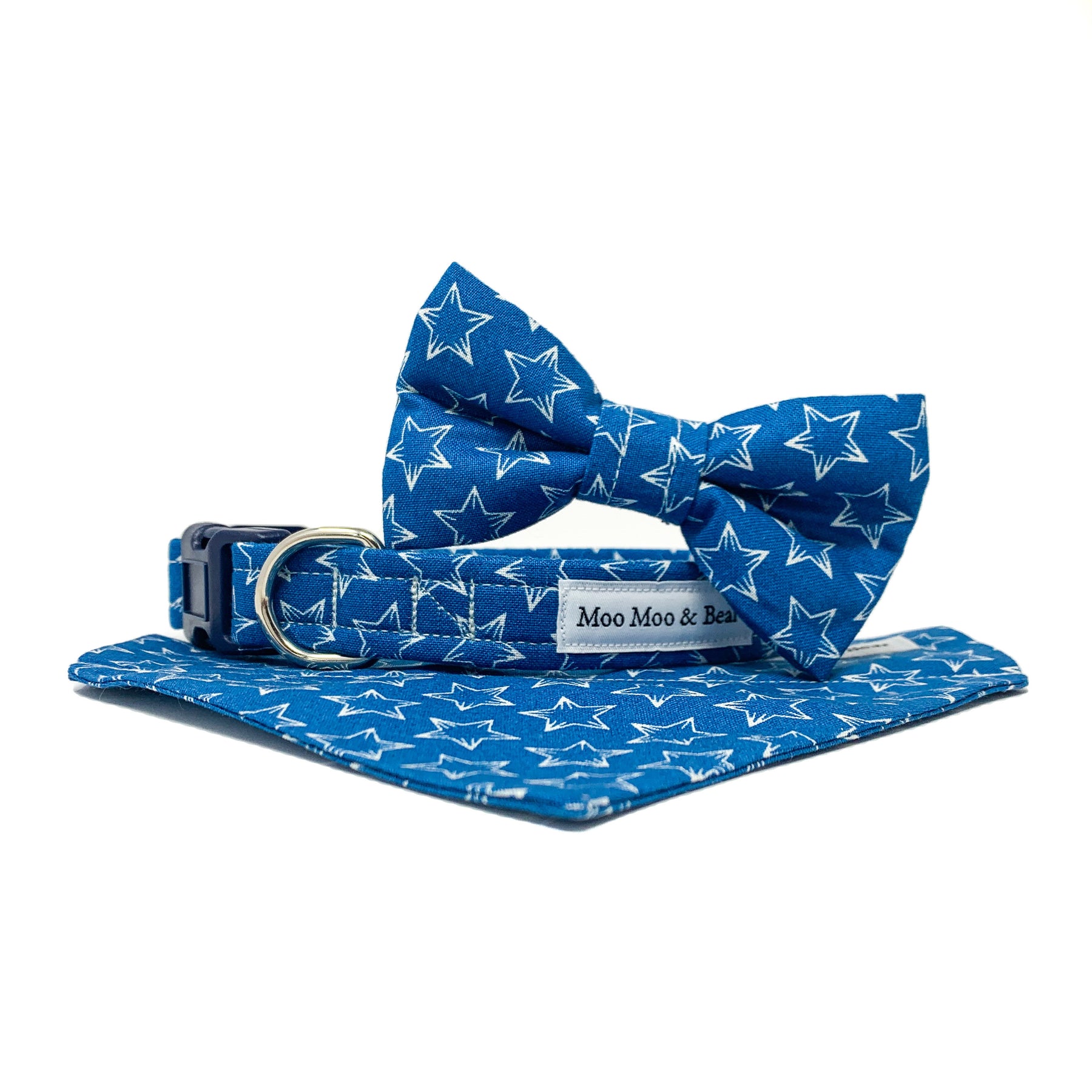 Dress to impress with the Bobby Dazzler collection. A star filled print ready to stand out from the crowd with a soft blue background and scattered with lush off white stars in an all over print. Ready to make a statement? We have matching collar accessories for a full outfit and co-ordinated look.
