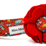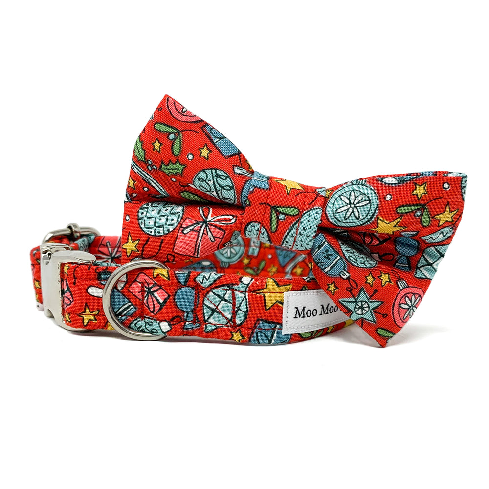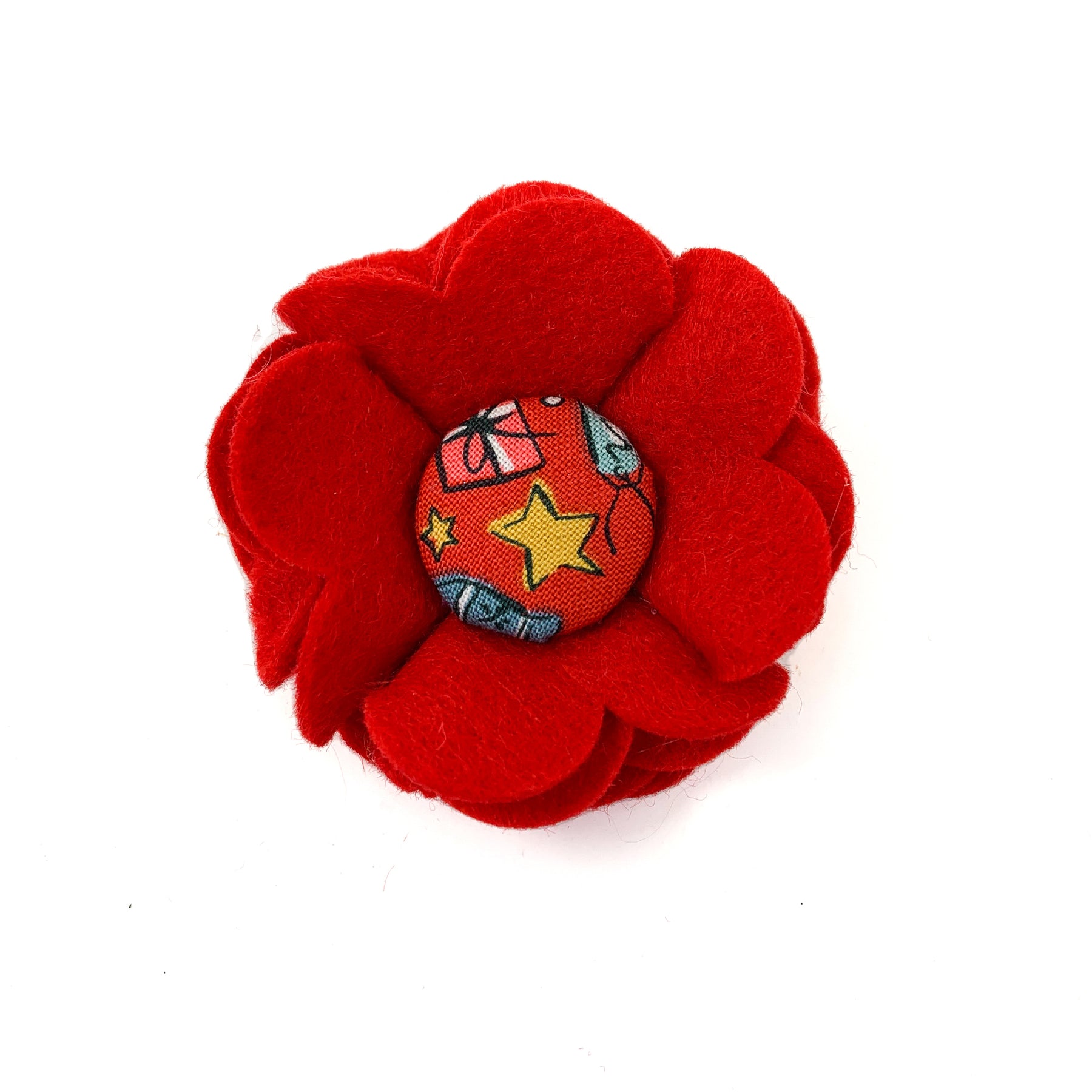 A pretty decorative wool blend felt dog collar flower in a bold and bright felt combined with a Liberty of London festive joy handmade button to compliment your dog collar.