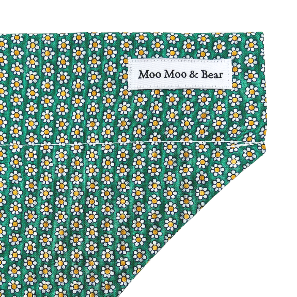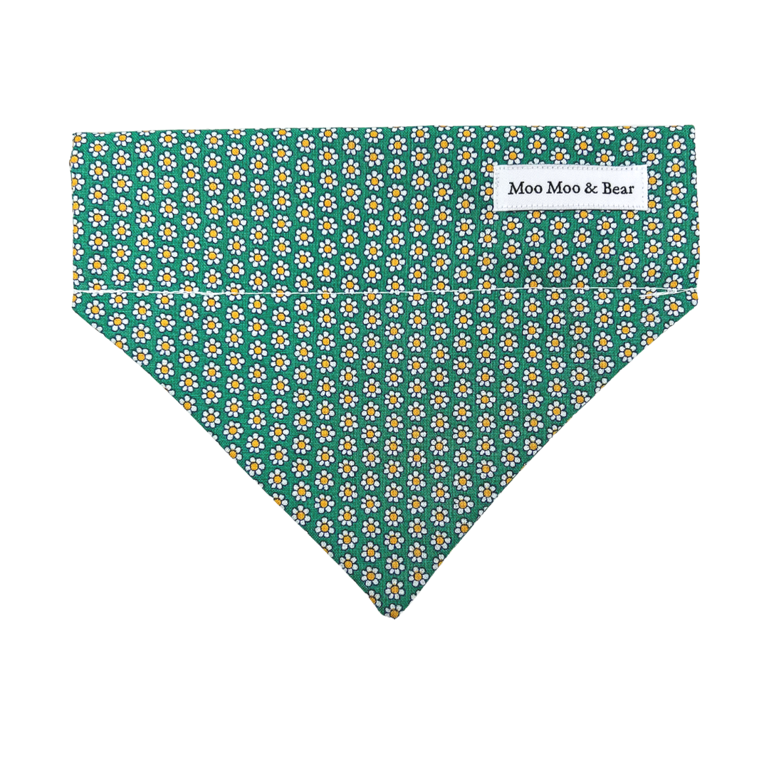 The Daisy Dot dog bandana from Liberty of London is a gorgeous and cute simple daisy pattern on a fresh green background.
