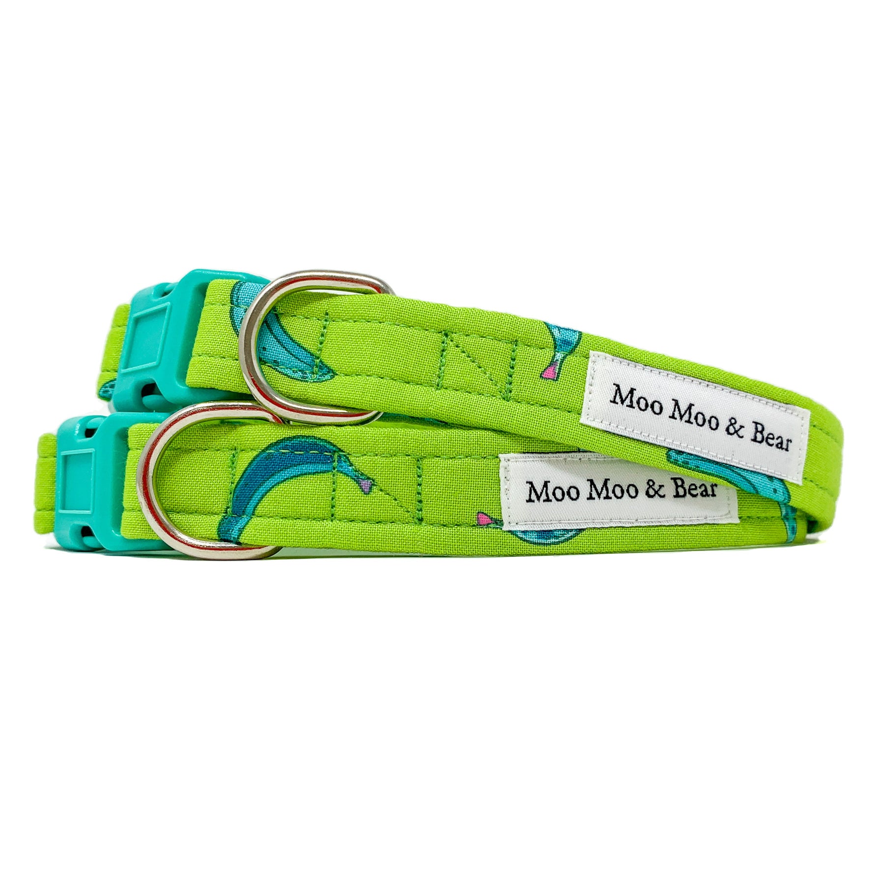 Is your pup a mischief maker? This may well be the perfect dog collar for them. A fun bright lime green collar dotted with bananas and skins. For extra mischief and the full monkey business look, we have matching collar accessories.