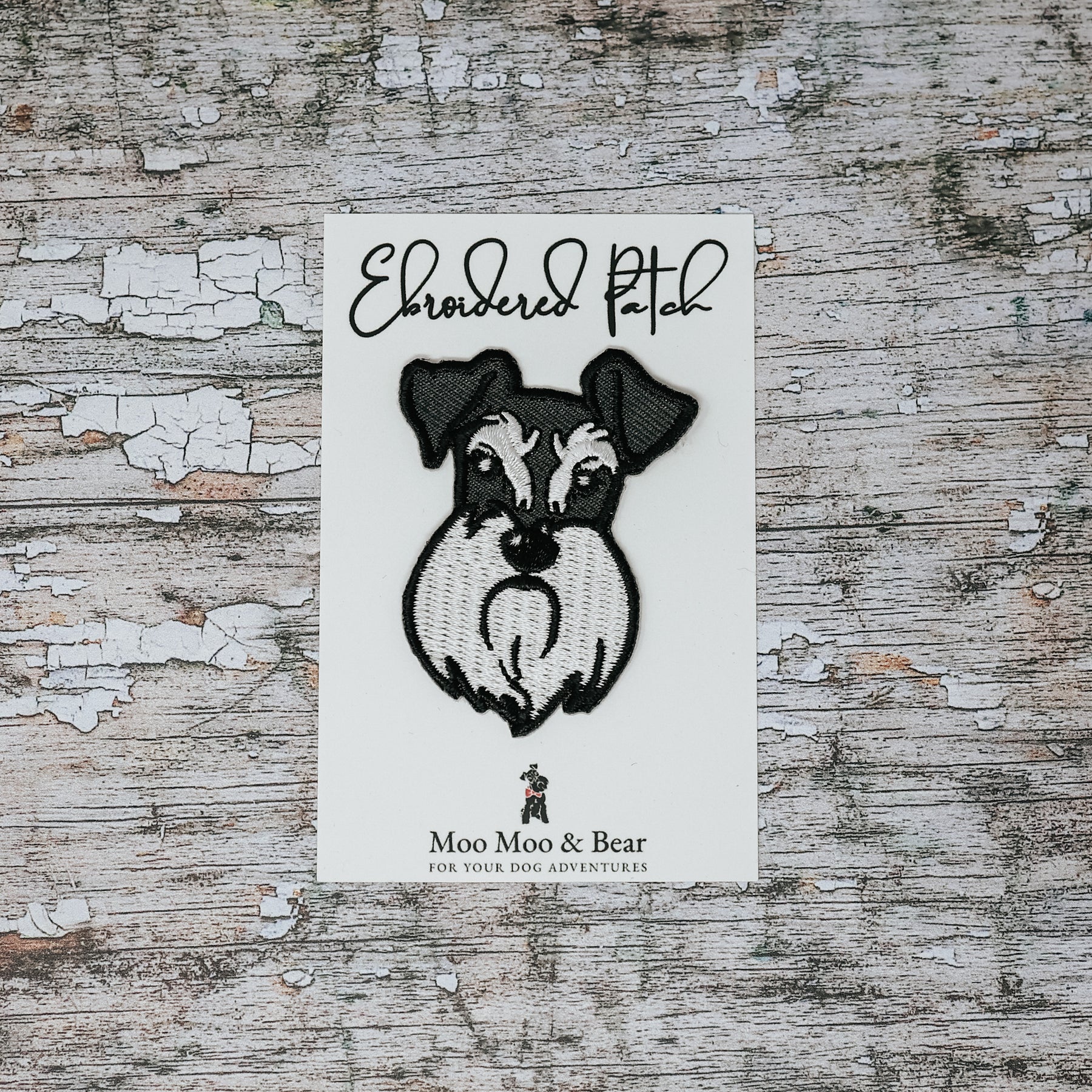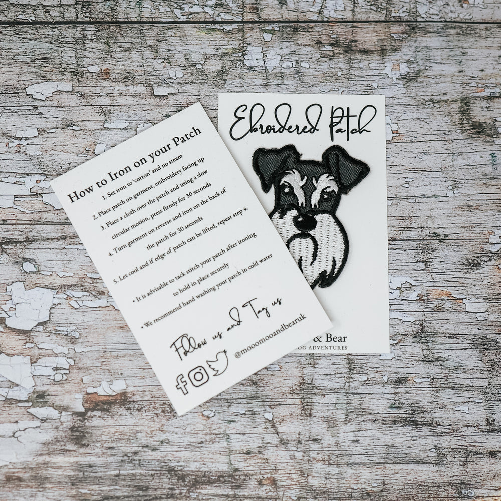 Featuring an original design from Moo Moo & Bear, this beautiful Pepper and Salt schnauzer head embroidered patch has an iron on backing allowing a patch to be applied with speed and ease.