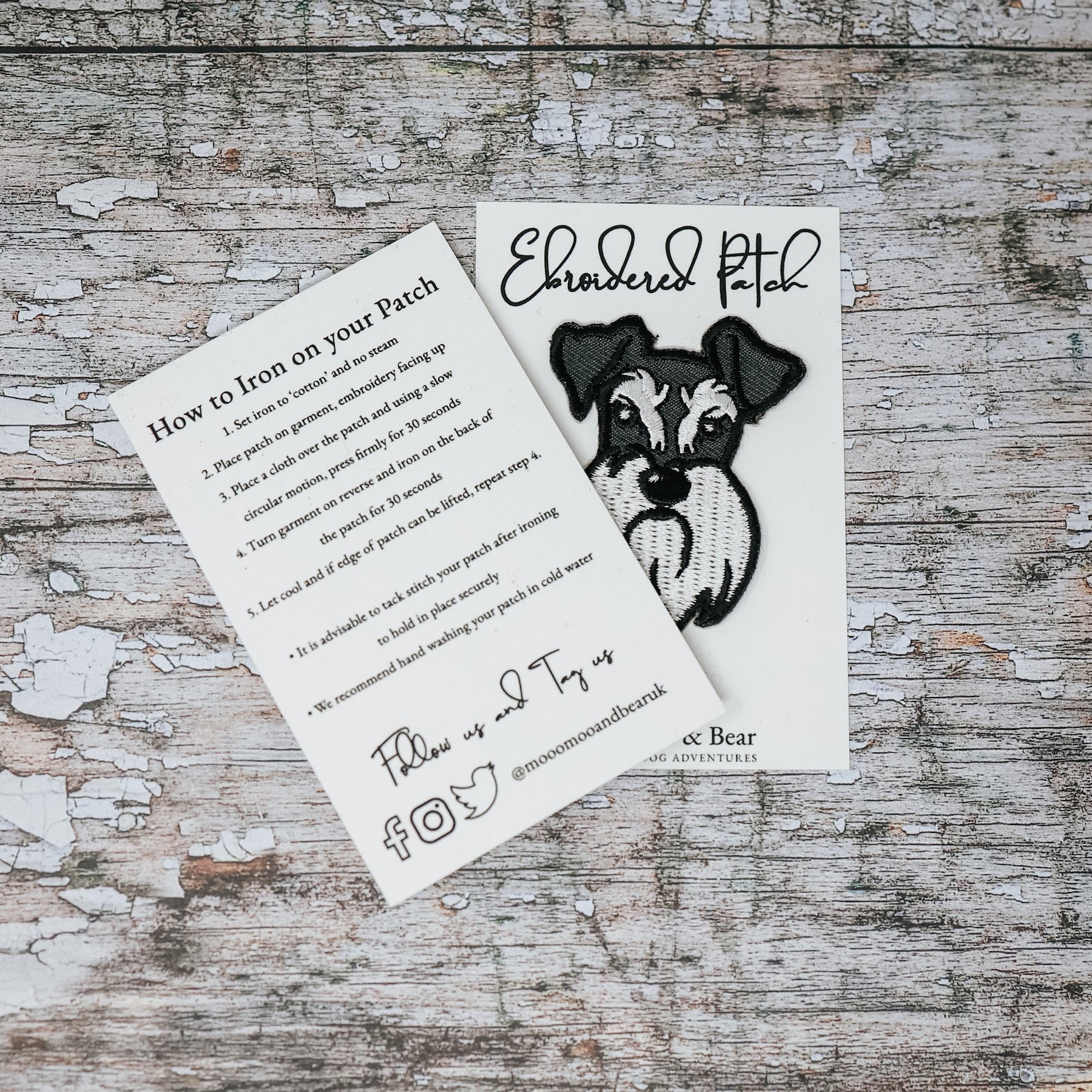 Presented on a deluxe matte finish thick backing card. The reverse offers all the instructions to apply to your chosen item of clothing. A perfect accessory for every schnauzer or schnauzer lover.